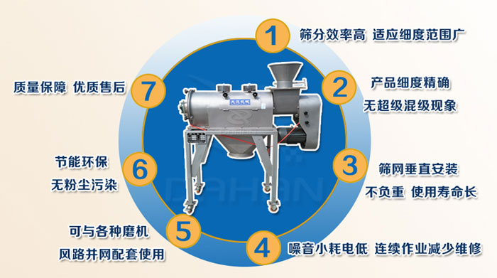 本產(chǎn)品為304不銹鋼臥式氣流篩設(shè)備。其型號為18-65WQS氣流篩,18指氣旋篩網(wǎng)籠的直徑,65指網(wǎng)籠長度。WQS氣旋篩由于形狀為橫臥狀所以也叫臥式氣流篩或臥式氣流篩粉機(jī),網(wǎng)為圓筒狀,置于機(jī)體內(nèi),物料通過螺旋輸送系統(tǒng)后,和氣流混合、霧化進(jìn)入網(wǎng)筒內(nèi);通過網(wǎng)筒內(nèi)風(fēng)輪葉片使物料同時受離心力和旋風(fēng)推進(jìn)力,從而近使物料噴射過網(wǎng),由細(xì)料排出口排出,不能過網(wǎng)的物料沿網(wǎng)筒壁從粗料排出口排出。